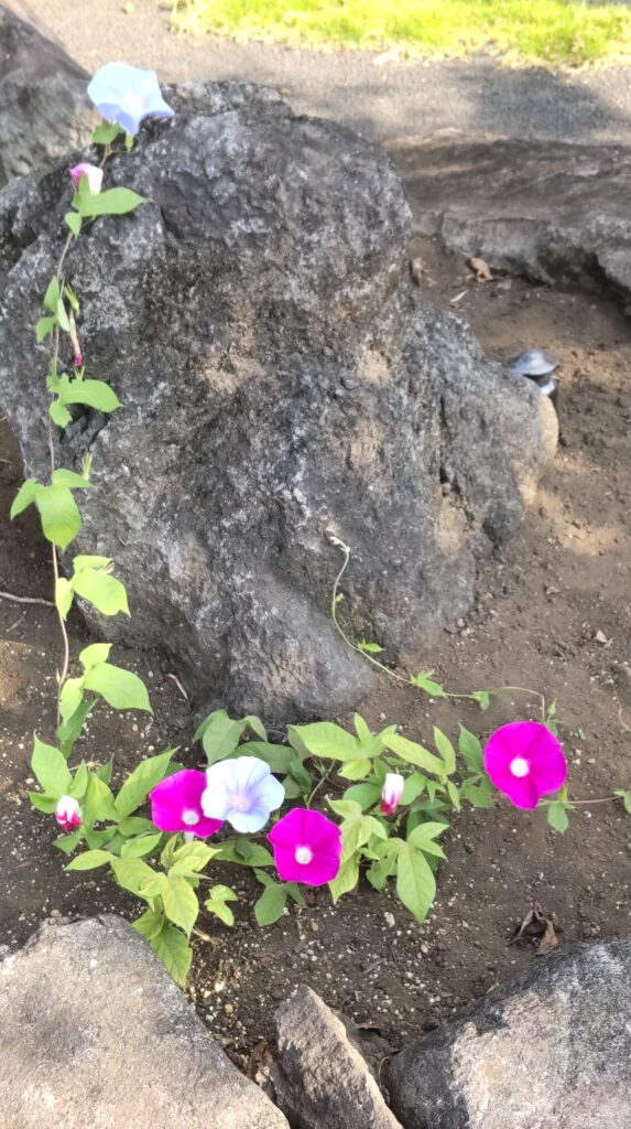 志保の花壇の朝顔ですが、なんと本日は5輪もの花が咲いていましたよ!